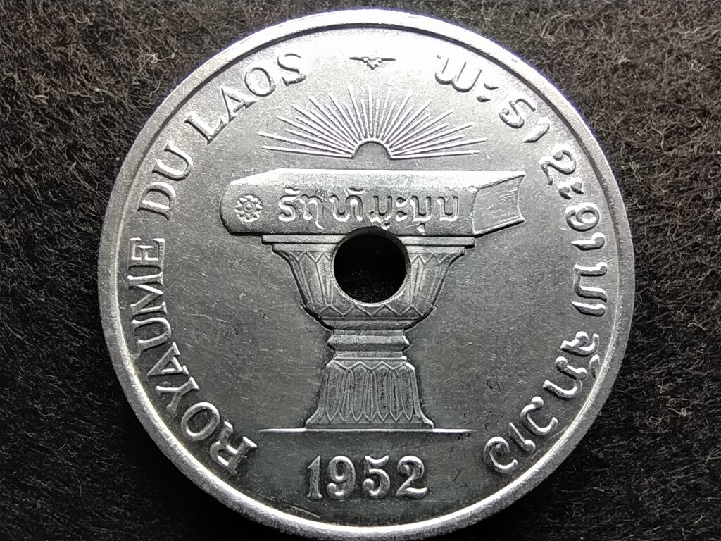 A laoszi pénzverés is Sisavang Vong uralkodása alatt kezdődött, amikor a Laoszi Királyság megalakult. Az első laoszi érmék 1952-ben jelentek meg, és a francia indokínai piastra alapján készültek.